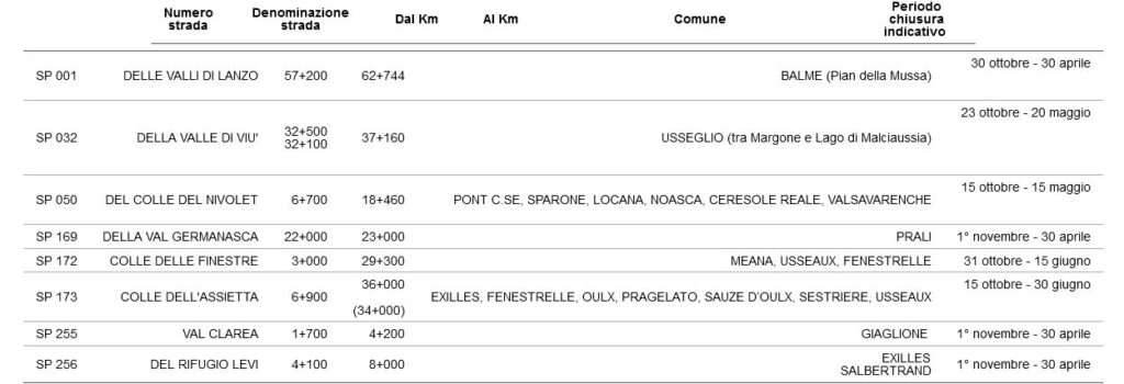 Tutti i veicoli, nel periodo invernale, sono obbligati a viaggiare con le catene a bordo o con pneumatici da neve nei tratti di strada maggiormente a rischio di gelate e di consistenti nevicate. L’obbligo deriva da un’ordinanza emessa dalla Città metropolitana di Torino. Nella maggior parte dei casi l’obbligo scatta il 15 novembre, ma nel caso di alcune tratte di strade dal 1 novembre. Nel periodo invernale inoltre i tratti finali di alcune strade di alta montagna vengono chiusi al traffico per motivi di sicurezza.
