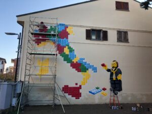 Tanti mattoni colorati per costruire l’Italia. Cavour gioca con i Lego nel nuovo murales Santenese realizzato da Teo Bungaro e Roberto Lotrecchiano, su un muro del cortile delle scuole elementari Cavour, in via Vittorio Veneto.
