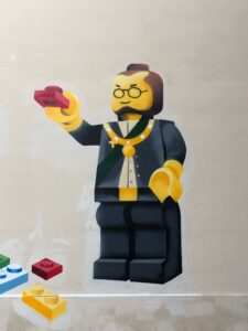 Tanti mattoni colorati per costruire l’Italia. Cavour gioca con i Lego nel nuovo murales Santenese realizzato da Teo Bungaro e Roberto Lotrecchiano, su un muro del cortile delle scuole elementari Cavour, in via Vittorio Veneto.