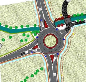 La scelta progettuale per le due strade sterrate comunali, utilizzate principalmente per le attività agricole e separate da un canale irriguo di modesta portata, è stata quella di convogliarle in un unico braccio, per poi prevedere una successiva biforcazione, con l’utilizzo di un attraversamento situato a circa 15-20 metri a valle dalla rotatoria.