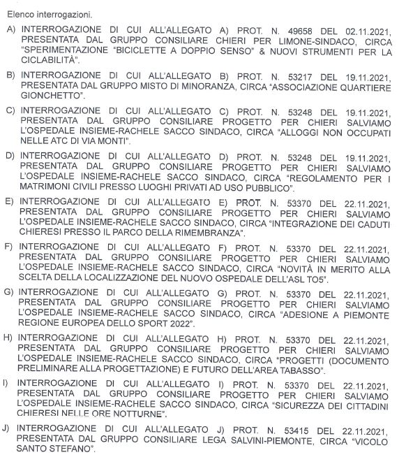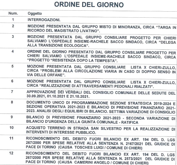 Chieri. Consiglio comunale lunedì 29 e martedì 30 novembre. L’ordine del giorno