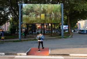 Mercoledì 24 novembre alle ore 18.30 si inaugura in piazza Bottesini e in diretta Facebook – @flashbackfair – l’ottavo manifesto di Opera Viva Barriera di Milano, progetto ideato da Alessandro Bulgini, curato da Christian Caliandro e sostenuto dalla fiera d’arte Flashback Estrusione 02#01 di Tatiana Villani (2020). Per questa ottava puntata, Tatiana Villani presenta un’immagine tratta dal suo progetto Estrusione 35 cm³ (che ha avuto una prima versione nel 2017 in un lago artificiale a Empoli, nell’ambito di Un sentiero di segni / Arte e Ambiente). Nel 2020 la scultura, un cubo trasparente, viene posta sulla superficie del lago di Massaciuccoli (Lucca), facendo emergere la parte che solitamente è sommersa e che rimane sotto il livello dell’acqua. Dunque, elementi naturali come foglie, rami, insetti. L’installazione e la fotografia documentativa scavano nella realtà del paesaggio, rendendo visibile l’invisibile. In particolare, questa estrusione a Massaciuccoli è avvenuta a inizio settembre 2021, nel canale del porto, vicino all’ingresso di un “chiaro”: l’elemento cubico è stato posto su un “aggallato”, una piccola isola composta da un canneto galleggiante che fluttua sulle acque, un agglomerato molto importante per l’ecosistema della riserva. L’immagine di Tatiana Villani racconta le preoccupazioni ecologiche di questo momento storico, le trasformazioni continue degli ecosistemi, e come la natura sia in grado di riformarsi e di ricostruirsi. Come le è stato riferito dagli operatori della Lipu (Lega Italiana Protezione Uccelli), con cui l’artista ha stabilito un dialogo, fino al 2010 il lago e la zona palustre erano in sofferenza; le varie realtà che si occupano di quell’ambiente hanno tentato per anni di ripristinare condizioni sostenibili, ma i risultati si sono cominciati a vedere solo a partire dal 2012. Da quel momento, il lago ha cominciato “a fare da solo… Gli ecosistemi naturali, quando sono abbastanza estesi e complessi, hanno una capacità di resilienza che a volte non ti aspetti. È quello che sta succedendo sul lago di Massaciuccoli: dal 2012 è iniziata una lenta ricomparsa di vegetazione sommersa lungo tutta la sponda orientale e meridionale del lago” – commenta Tatiana Villani. Un nuovo inizio dunque – dal punto di vista sia ecologico, che culturale e sociale – non solo è possibile, ma è già in essere. Come ci testimoniano sia questo manifesto che quelli precedenti affissi in Piazza Bottesini.