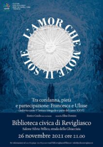 Venerdì 26 novembre 2021 L’AMOR CHE MOVE IL SOLE – Letture dalla Divina Commedia con accompagnamento musicale. Tra condanna, pietà e partecipazione: Francesca e Ulisse (Inferno, canto V lettura integrale e parte del canto XXVI). Biblioteca civica di Revigliasco, salone Silvio Pellico in strada della Ghiacciaia