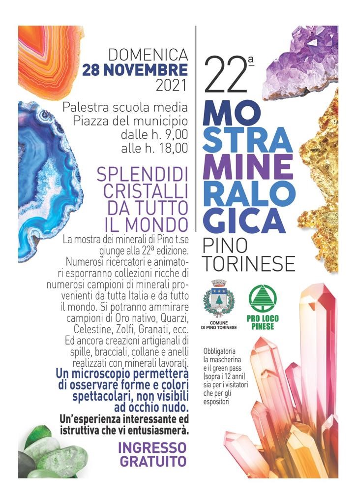 Dopo la sospensione dello scorso anno a causa della pandemia ritorna a Pino l’appuntamento ormai tradizionale con l’interessante Mostra Mineralogica. Siamo arrivati alla 22ma edizione! Un grazie speciale, oltre che alla nostra Proloco, a Roberto Giordano e Luciano Fabeni pinesi appassionati cultori di questa materia.