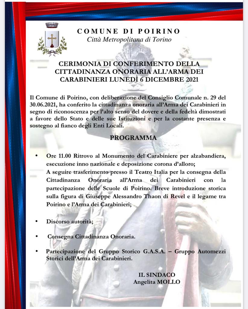 Poirino conferisce la cittadinanza onoraria all’Arma dei Carabinieri di Redazione · 29 Novembre 2021 Visto da: 124