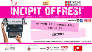 La Biblioteca Civica “Nicolò e Paola Francone” di Chieri ospita giovedì 16 dicembre, in presenza, la settima edizione di Incipit Offresi, il primo talent letterario itinerante dedicato agli aspiranti scrittori, ideato e promosso dalla Fondazione ECM – Biblioteca Archimede di Settimo Torinese, in sinergia con Regione Piemonte.