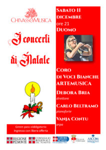 A Chivasso il week end di metà dicembre si presenta particolarmente ricco di appuntamenti musicali, che l’associazione Contatto ha preparato nell’ambito del cartellone “Attorno al Presepe”, con il patrocinio della Città Metropolitana di Torino. Sabato 11 dicembre alle 21 in Duomo è in programma il concerto del coro di voci bianche “Artemusica”, diretto da Debora Bria e con l’accompagnamento al pianoforte di Carlo Beltramo. La serata è suddivisa in due parti, nella prima delle quali sono in programma composizioni dei contemporanei Orlando Di Piazza (“Regina Caeli” e “Magnificat”), Lorenzo Donati (“Panis angelicus”, “Silent stars”, “Nova angeletta” e “Spes nostra”), Javier Busto Sagrado (“Salve Regina”, “Ave Maria”), Eric Whitacre (“Glow”). L’incursione nel repertorio romantico è affidata a due mottetti di Felix Mendelsshon Bartholdy: “Veni Domine” e “Laudate pueri – Beati omnes”. La seconda parte della serata, dopo un breve intervallo, si apre con “A ceremony of Carols” di Benjamin Britten, una liturgia di canti natalizi secondo la tradizione anglicana, nella cui esecuzione è previsto l’intervento dell’arpista Vanja Contu. A concludere la serata il brano “Sound of trumpet” di Henry Purcell, “Stille nacht” di Franz Gruber nell’armonizzazione di Riccardo Giavina, “Personent hodie” e “Star carol” del britannico John Rutter e “A Christmas Festival” di Leroy Anderson. L’ingresso è ad offerta libera ed è riservato al pubblico munito di Green Pass e di mascherina. Si ritornerà nel cortile dell’associazione Contatto in via Confraternita, domenica 12 dicembre dalle 15,30 alle 17, per l’esibizione di alcuni allievi dell’Istituto musicale comunale Sinigaglia appartenenti alle classi di arpa e di flauto traverso, alla presenza delle docenti Patrizia Radici e Fabienne Liuzzo. Al concerto il pubblico potrà accedere con offerta libera e con l’obbligo di tenere la mascherina.