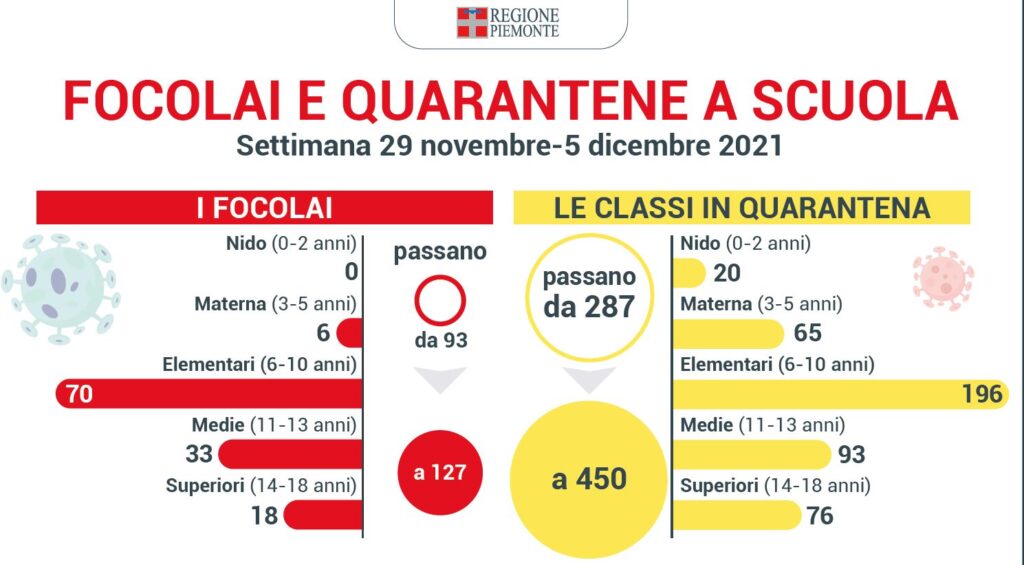Dal monitoraggio condotto dalla Regione Piemonte, nella settimana 29 novembre- 5 dicembre, la situazione del contagio nelle scuole registra un aumento dei focolai e delle quarantene, seppur contenuto rispetto alla totalità delle classi scolastiche presenti sul territorio piemontese. Nel dettaglio, i focolai passano da 93 a 127: 0 nei nido (età 0-2 anni), 6 nelle scuole dell’infanzia (3-5anni), 70 nelle scuole primarie (6-10 anni), 33 nelle scuole secondarie di 1°grado (11-13 anni), 18 nelle scuole superiori (14-18 anni). Suddivisi su base provinciale: 7 Alessandria (4 primarie, 2 medie, 1 superiori), 4 Asti (4 primarie), 6 Biella ( 2 primarie, 4 medie), 28 Cuneo (1 infanzia, 16 primarie, 9 medie, 2 superiori), 22 Novara (3 infanzia, 12 primarie, 2 medie, 5 superiori), 29 Torino città (1 infanzia, 15 elementari, 5 medie, 8 superiori), 26 Torino città metropolitana (1 infanzia, 14 primarie, 9 medie, 2 superiori), 2 Vercelli (1 primaria, 1 media), 3 VCO (2 primaria, 1 media). Passano invece da 287 della scorsa settimana a 450 le quarantene: 20 nei nidi, 65 nelle scuole dell’infanzia, 196 classi nelle scuole primarie, 93 classi nelle scuole secondarie di 1° grado, 76 classi nelle scuole superiori. Suddivise su base provinciale, le classi in quarantena sono 22 nell’Alessandrino (1 nido, 6 infanzia, 5 primaria, 8 medie, 2 superiori), 19 nell’Astigiano (1 infanzia, 10 primarie, 3 medie, 5 superiori), 6 nel Biellese (2 primarie, 4 medie ), 85 nel Cuneese (5 nido, 16 infanzia, 38 primarie, 19 medie, 7 superiori), 53 nel Novarese (5 nido, 7 infanzia, 23 primarie, 4 medie, 14 superiori), 79 Torino città (9 nido, 14 infanzia, 29 primarie, 11 medie, 16 superiori), 169 Torino città metropolitana (20 infanzia, 79 primarie, 39 medie, 31 superiori), 7 nel Vercellese (1 infanzia, 4 primarie, 1 medie, 1 superiori), 10 nel VCO (6 primarie, 4 medie).