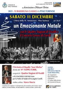 Vivaldi con le Quattro Stagioni e Corelli con il Concerto Grosso “Fatto per la Notte di Natale” saranno i protagonisti dell’emozionante Concerto che l’Associazione Santa Maria del Pino proporrà sabato 11 dicembre. Il Concerto rientra nella Rassegna “Classica a Pino” giunta alla sua VII edizione: un’iniziativa che riscuote sempre un grande successo ed è la dimostrazione concreta di come istituzioni diverse possano collaborare tra di loro. L’eccezionale livello dei musicisti proposti è assicurato grazie alla collaborazione con l’Associazione Mozart Torino, nella persona del Maestro Roberto Issoglio, il quale con costanza e tenacia porta a Pino artisti di fama internazionale.