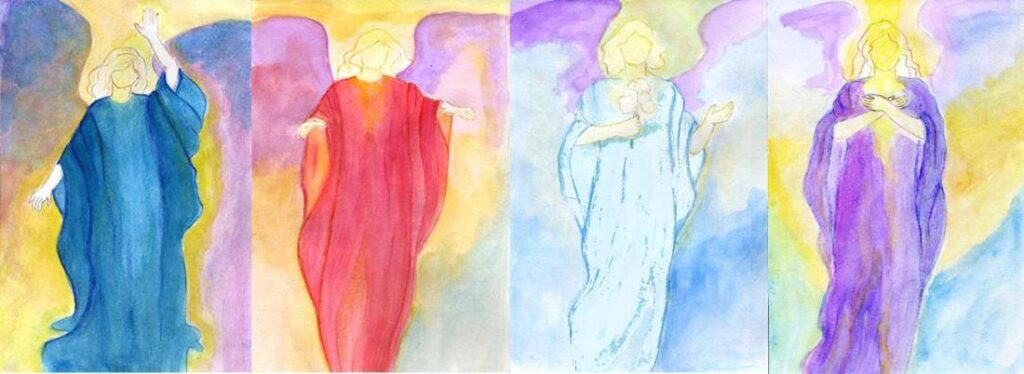 Sono quattro, come quattro sono le settimane che preparano al Natale e scendono ad uno ad uno sulla terra indossando abiti di colore diverso, ciascuno dei quali rappresenta una qualità peculiare.