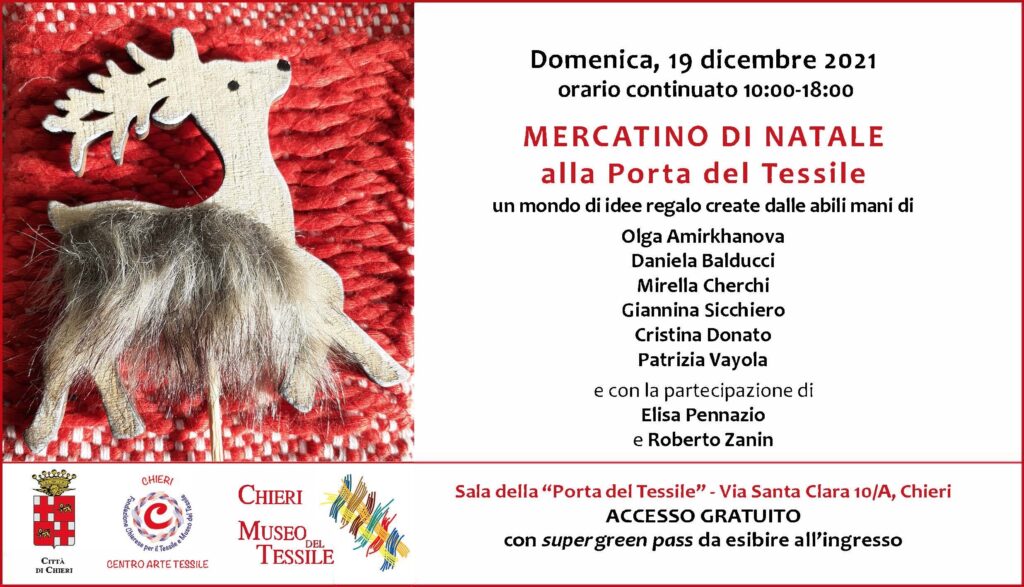 In occasione delle festività natalizie, la Fondazione Chierese per il Tessile è per il Museo del Tessile, organizza per domenica 19 dicembre, presso il salone della Porta del Tessile di via Santa Clara il Mercatino di Natale con idee regalo e dimostrazioni di filatura, tessitura, lavorazione del feltro e giochi in legno.(L.B.)