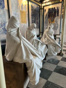 Ai Musei Reali, la mostra In Between di Fabio Viale si arricchisce di un allestimento inedito: nel Salone delle Guardie Svizzere di Palazzo Reale, il gruppo Amore e Psiche lascia il posto all’opera Le Tre Grazie, composta da tre figure femminili con un riferimento esplicito sia al mito greco, sia al capolavoro di Canova. L’installazione ha come oggetto una scena che lo scultore vide alcuni anni fa durante uno dei suoi frequenti viaggi in Maghreb, immortalata nello scatto del compagno di viaggio Battista Fasano: tre donne sedute sotto una pensilina del bus a Ghardaia, città algerina di religione islamica, dove il tradizionale haik femminile è un’ampia e lunga veste bianca che avvolge tutto il corpo, lasciando scoperto soltanto un occhio. La femminilità e la presenza del corpo, dissimulate, sono rese plasticamente dal movimento e dalla volumetria, attraverso un virtuosismo tecnico capace di creare un gioco tra il pieno e il vuoto, donando potenza e leggerezza alle sculture.