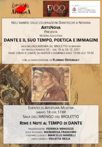 L’ associazione culturale Artenova, partecipe del “Comitato Dante e Novara” promosso dal Comune di Novara, celebra questa importante ricorrenza per la cultura con la realizzazione di una mostra collettiva dal titolo “DANTE E IL SUO TEMPO, POETICA E IMMAGINI”. La mostra si terrà dal 18 al 26 dicembre 2021 e sarà allestita a cura di Patrizia Galassi nella sala dell’Accademia del Broletto di Novara. L’ inaugurazione avverrà il giorno 18 dicembre alle ore 17:00 presso la sala dell’Arengo del Broletto con un evento che ha per titolo RIME E NOTE AL TEMPO DI DANTE ideato da Eva Boglio e Silvio Fazio , con la presentazione della mostra a cura della professoressa Federica Mingozzi, la voce narrante di Mariarosa Franchini , la chitarra classica di Marcello Nardilli e la videoclip di Violetta Viola. Le opere in mostra sono 50 di 37 artisti e la partecipazione straordinaria della scultrice Florin Offergelt.