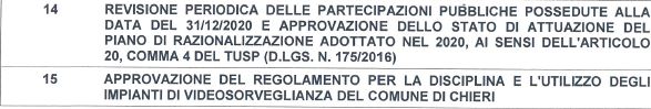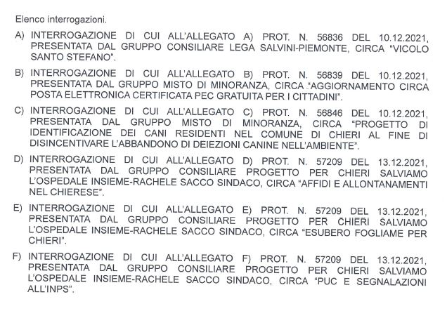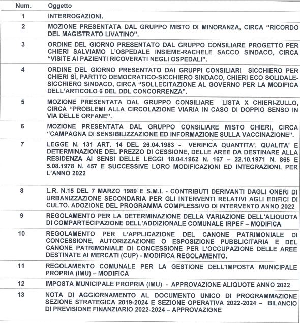 L’ultima seduta per il 2021 del consiglio comunale di Chieri è convocato per lunedì 20 e martedì 21 dicembre alle 19,45. Lunedì 20alle 19,10 il question time su due interrogazioni da parte di cittadini.