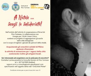 – Pikine Est in Senegal, acquistando gli orecchini e accessori di artigianato senegalesi, distribuiti dai ragazzi della Consulta Giovani Pinese: i fondi raccolti con quest’ultima iniziativa saranno devoluti per sostenere il progetto di aggregazione giovanile a Pikine Est con lo scopo di togliere i loro giovani dai pericoli della strada (iniziativa nell’ambito del progetto di Cooperazione Internazionale del Comune di Pino Torinese in collaborazione con Energia per i Diritti Umani Onlus).