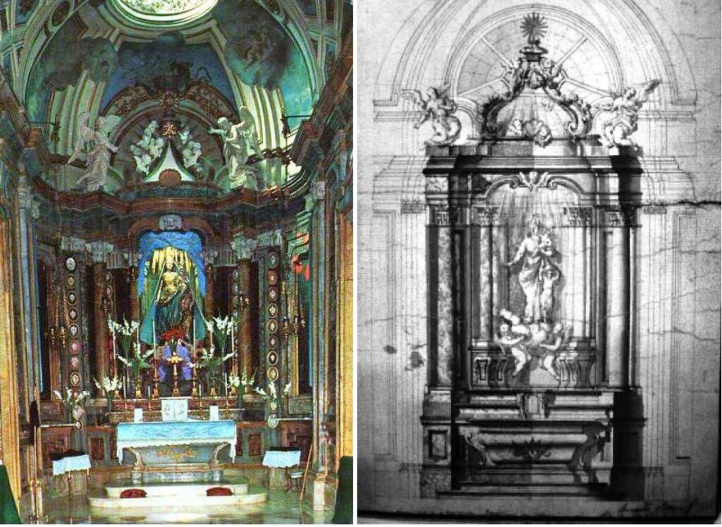 In foto la Cappella della Madonna delle Grazie oggi e nel disegno di Ludovico Quarini