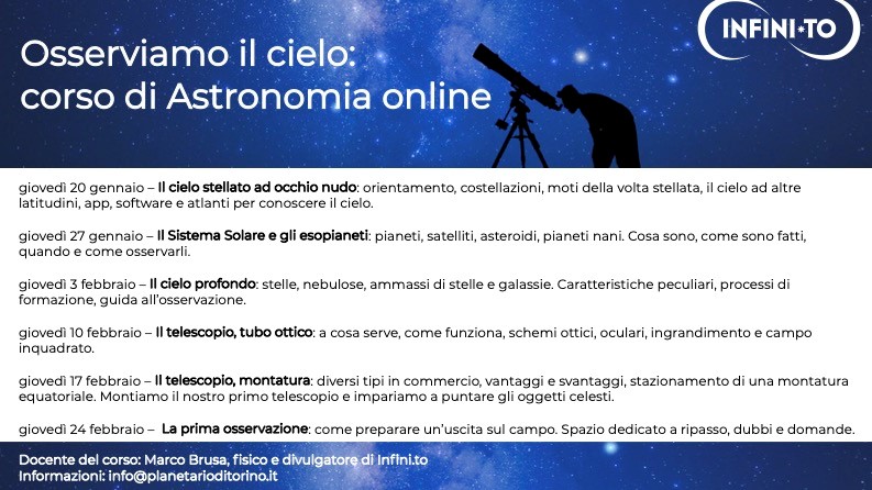 In partenza la nona edizione del Corso di Astronomia online: Osserviamo il cielo. Stelle, costellazioni, pianeti, nebulose e galassie: imparare a osservare il cielo attraverso 6 appuntamenti online con Marco Brusa, Fisico e divulgatore di Infini.to – Planetario di Torino. Gli incontri si svolgeranno di giovedì, dal 20 gennaio al 24 febbraio, dalle 20.00 alle 21.30.
