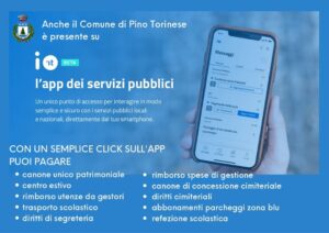 Anche il Comune di Pino Torinese aderisce all’App IO, con l’obiettivo di semplificare il rapporto tra cittadini, imprese e amministrazione rendendo i servizi digitali del Comune disponibili in IO così che gli utenti, tramite smartphone, possano usufruirne in maniera semplice e intuitiva. Per accedere ai servizi del Comune, dalla scheda Servizi dell’app IO, è sufficiente cliccare su “Locali”, ricercare e selezionare il “Comune di Pino Torinese”.