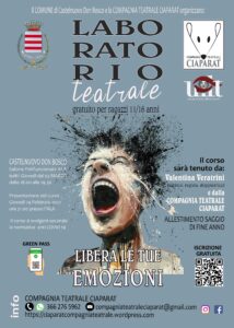 La Compagnia Teatrale CIAPARAT Aps e il Comune di Castelnuovo Don Bosco, organizzano un corso teatrale per ragazzi dagli 11 ai 16 anni completamente gratuito. A causa dell’impatto negativo della pandemia sugli adolescenti, il progetto pone come obiettivi il miglioramento della capacità di comunicare, di fare gruppo e di affinare la propria gestione dell’emotività.Il corso sarà strutturato in 15 lezioni e sarà tenuto da Valentina Veratrini ( attrice professionista, regista teatrale e doppiatrice) in collaborazione con i membri della nostra associazione. Il laboratorio teatrale si terrà ogni Giovedì (a partire dal 3 Marzo 2022 sino al 16 Giugno 2022) presso il salone polifunzionale ALA di Castelnuovo Don Bosco, nella fascia oraria 18.00 / 19.30.A fine corso verrà allestito un saggio conclusivo. Giovedì 24 Febbraio alle ore 21.00 presso il salone polifunzionale ALA , si terrà l’incontro per la presentazione del corso e durante la serata potrà essere effettuata l’iscrizione. Possibilità di pre-adesione on line collegandosi al link presente sulla locandina dell’evento ( QR CODE )https://docs.google.com/forms/d/1DdMd4Wfdpzt_NgD1-qUHgNJr1sKIBIsazMFs1Uv9Jyw/editIn ottemperanza delle vigenti normative, in materia di prevenzione e diffusione del virus COVID19,verranno attuate tutte le disposizioni previste dalla legge. L’ingresso sarà consentito solo ai possessori di Green Pass rafforzato ( vaccinazione o guarigione).