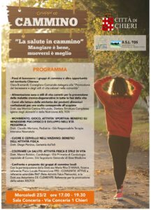 Il Comune di Chieri, in collaborazione con l’AslTO5 e i “Gruppi di Cammino” di Chieri e del chierese, organizza mercoledì 23 febbraio, dalle ore 17, presso la Sala Conceria di Chieri (via Conceria, 1), un momento informativo e formativo dal titolo «LA SALUTE IN CAMMINO. Mangiare è bene, muoversi è meglio»