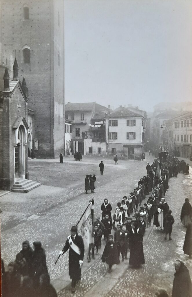 Era il 18 febbraio 1922. In quel freddo sabato mattina un fotografo, rimasto anonimo, posò la sua macchina fotografica e il suo cavalletto sul balcone di una casa che si affaccia su Piazza del Duomo. Con nove scatti in sequenza fotografò un lungo interminabile corteo, che giungeva in Duomo dopo aver percorso un lungo tratto delle vie del centro storico. Era il funerale di Giacomo Vastapane. Sono passati cento anni e quelle foto (per motivi di spazio ne viene pubblicata solo una) ci mostrano una piazza con le lose, con una striscia di neve ghiacciata, ci mostrano particolari architettonici ora mutati. Quei nove scatti ci raccontano di un funerale di “Nona categoria” che prevedeva la presenza del Capitolo dei canonici, delle orfane con i ceri in mano, del Duomo addobbato con lunghi drappi neri. Manca solo di sentire i rintocchi del campanone, mosso a braccia con un preciso sistema che si è perso e dimenticato. Un funerale solenne per uno dei più importanti industriali tessili chieresi, morto a soli 49 anni d’età il 15 febbraio 1922. Giacomo Vastapane era nato a Riva presso Chieri l’11 ottobre 1872 e si dedicò con energia ai suoi due stabilimenti di Chieri e di Poirino, che davano lavoro a circa seicento persone, riuscendo a esportare i suoi tessuti e le sue coperte sui mercati esteri. Uomo stimato in primo luogo dai suoi operai “copertieri” e da tutti i suoi dipendenti, per i quali organizzava scampagnate. Se al suo funerale partecipò una città intera e tutte le Associazioni, i Circoli, le Società, le Pie Istituzioni, gli Oratori, le Confraternite, fu perché in vita fu un grande benefattore, condividendo i suoi utili con chi si dedicava ai più bisognosi, l’Ospedale per primo. Ma non solo. L’anno dopo la sua morte fu inaugurato nel cortile della fabbrica (ora Viale Fasano N°70) un busto in bronzo con la seguente dedica:
