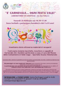 Venerdì 25 febbraio, dalle ore 16.30 alle 17.30, laboratorio per i bimbi dai 3 ai 6 anni presso la Ludoteca di Pino Torinese (via S. Felice, 2).I bimbi potranno inventare simpatiche storie e realizzare gadget a tema “carnevalesco” con materiali di recupero. Evento realizzato in collaborazione del Museo delle Contadinerie di Valle Ceppi. Per info e prenotazioni: Centro PariDispari centroparidispari@gmail.com / tel. 011.8119191