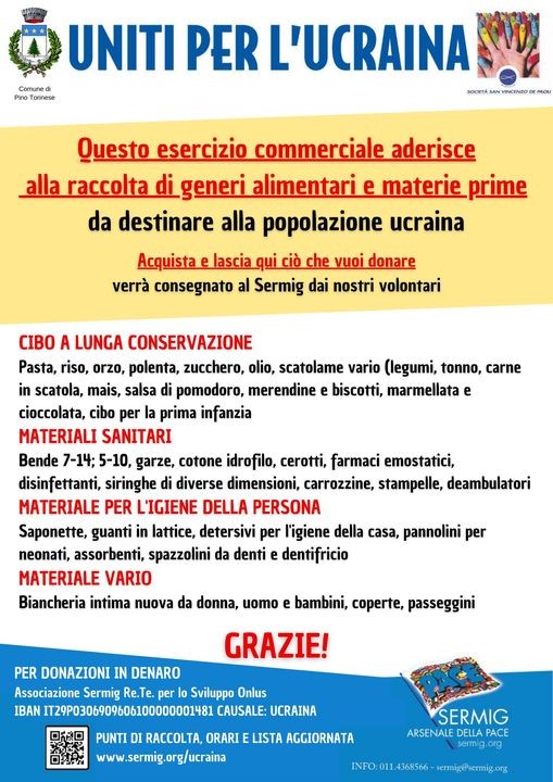 Il Comune di Pino Torinese, in collaborazione con la Società San Vincenzo De Paoli, aderisce all’iniziativa del Sermig “Uniti per l’Ucraina”. A partire da sabato 5 marzo è possibile acquistare e consegnare presso i negozi di Pino Torinese aderenti generi alimentari e per la cura della persona da destinare alla popolazione ucraina. I materiali raccolti verranno consegnati al Sermig (punto di raccolta “Arsenale dell’Armonia” di Pecetto T.se): i negozi che aderiscono a questa iniziativa sono riconoscibili perché espongono la locandina qui di seguito pubblicata.