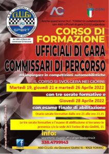 L’Automobile Club Torino in collaborazione con l’asd Ufficiali di Gara “CiUGì” organizza un corso per Commissari di Percorso conformemente al Regolamento Sportivo Nazionale 2022. Gli Ufficiali di Gara sono figure indispensabili nell’organizzazione delle gare, nelle quali svolgono compiti di controllo e sorveglianza, a seconda della qualifica per la quale sono stati abilitati. L’abilitazione degli Ufficiali di Gara, è concessa da Aci Sport in base alle procedure che sono indicate nella Appendice 2, sul sito www.acisport.it. Gli Ufficiali di Gara possono esercitare le funzioni per le quali sono abilitati in tutte le gare in Italia. I candidati, per l’ammissione ai corsi per l’ottenimento delle varie licenze di Ufficiale di Gara devono avere i seguenti requisiti: • cittadinanza italiana o straniera, purché l’interessato sia stabilmente residente in Italia da almeno due anni; • età non inferiore ai 18 anni; • possesso della patente di guida o in mancanza certificato attestante il superamento della visita medica prevista per il rilascio della patente B; • è ammessa l’autocertificazione per quanto consentito dalla legge. Questi soggetti, una volta abilitati, sono inseriti in albi provinciali gestiti dagli Automobile Club Provinciali e dalle associazioni licenziate. Il corso si svolgerà nei giorni 19, 21, 26 e 28 aprile 2022 presso la sede dell’asd UdG “CiUGì” in Via Giolitti 15, Torino. Il corso è gratuito. Per informazioni ed iscrizioni rivolgersi alla segreteria dell’asd UdG “CiUGì” Torino telefono 338 4799143; mail: segreteria-ciugi@ufficialigaraacitorino.it; www.ufficialigaraacitorino.it