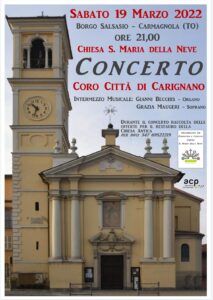 Sabato 19 marzo alle 21 nella chiesa antica Madonna della Neve di Salsasio in via Torino 191 a Carmagnola si terrà il “Concerto di San Giuseppe” con lo scopo di raccogliere fondi per il restauro degli interni della chiesa antica di Salsasio. L’evento organizzato dalla Parrocchia Santa Maria di Salsasio e dal Comitato “Chiesa Madonna della Neve” che si occupa di raccogliere fondi per il restauro e la salvaguardia della storica chiesa madre della Parrocchia, vedrà il coro “Città di Carignano” dell’associazione Corale Carignanese intrattenere il pubblico con il suo repertorio. Durante la serata intramezzo musicale a cura di Gianni Becchis che suonerà l’antico organo accompagnato dal soprano Grazia Maugeri. Verranno presentati i lavori fatti fino ad ora alla chiesa e quelli in progetto per il futuro. È possibile fare la propria donazione anche tramite bonifico bancario intestato a “Comitato Chiesa Madonna della Neve” – IBAN: IT67I0883330262000160100497