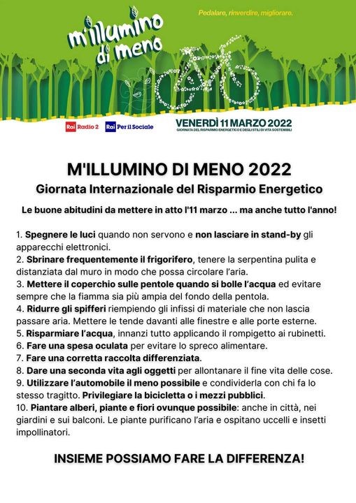 Il Comune di Pino Torinese aderisce all’edizione 2022 di “M’Illumino di meno”