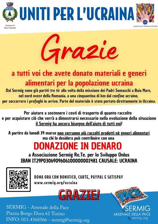 A partire da lunedì 14 marzo pertanto presso gli esercizi commerciali di Pino non verranno più raccolti prodotti né generi alimentari per l’Ucraina ma chi lo desidera può contribuire con una DONAZIONE IN DENARO secondo le modalità indicate nella locandina.