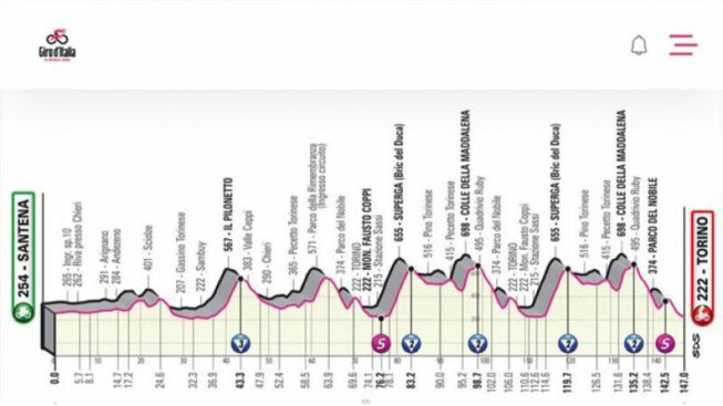 La tappa del Giro d’Italia Santena-Torino, che si disputerà il prossimo 21 maggio 2022, per motivi di sicurezza è stata modificata nel suo percorso. Sono stati tolti i passaggi del gruppo da Santa Brigida, Cavoretto e Val Pattonera ed inserito un giro più lungo verso Riva presso Chieri, Andezeno, Marentino, Sciolze e Gassino, poi la salita di Rivodora verso Superga ma con svolta a sinistra al bivio del Paluc con discesa verso Chieri e poi Pecetto attraverso il Parco della Rimembranza. Poi, l’inserimento di un circuito che prevede due volte la Maddalena, il Parco del Nobile e la Sassi-Superga. In tutto 147 km per 3000 metri di dislivello.