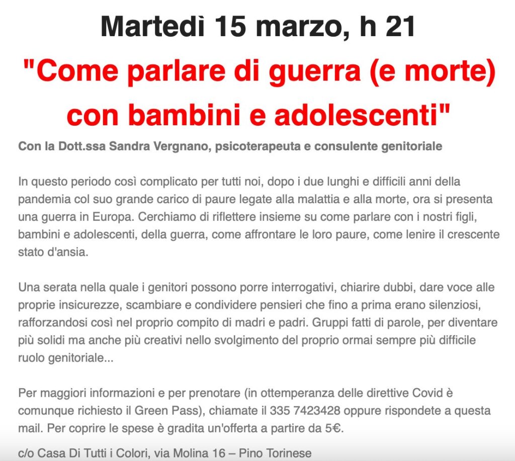 Pino Torinese. Martedì 15/3 “Come parlare di guerra (e di morte) con bambini e adolescenti”