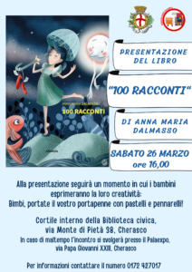 Le Biblioteche civiche di Cherasco e Roreto aderiscono al progetto: sabato 26 marzo 2022, alle ore 16, propongono per la “Settimana della promozione della lettura” la presentazione del libro “100 racconti di nonna Anna” a cura di Anna Maria Dalmasso. Sarà un momento per permettere di dar sfogo alla creatività dei bambini, che all’appuntamento dovranno andare muniti di colori, pastelli e pennarelli.