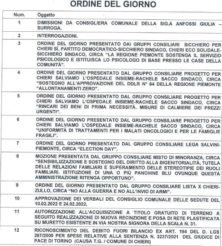 Ancora a porte chiuse il consiglio comunale di Chiueri, convocato il 31 marzo e 1° aprile alle 19,45.  Di seguito l’ordine del giorno completo.