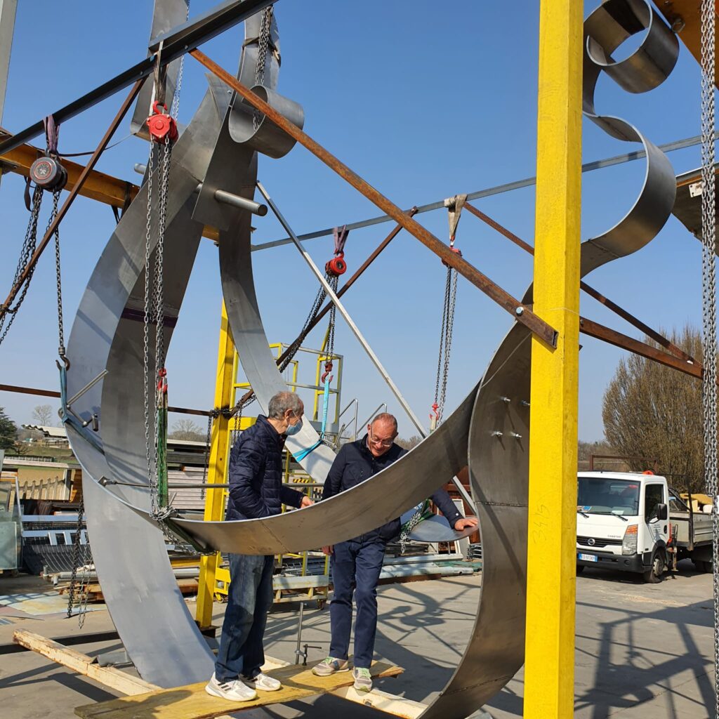 Lavori in corso per il monumento destinato a celebrare l’arrivo e la presenza a Chieri dei Veneti. Sarà collocato nella rotonda di Strada Riva: nella foto, lavori in corso in cantiere, sotto l’occhio attento dell’artista autore del bozzetto, Leonardo Zago, e del direttore lavori, l’ingegner Angelo Rubatto.