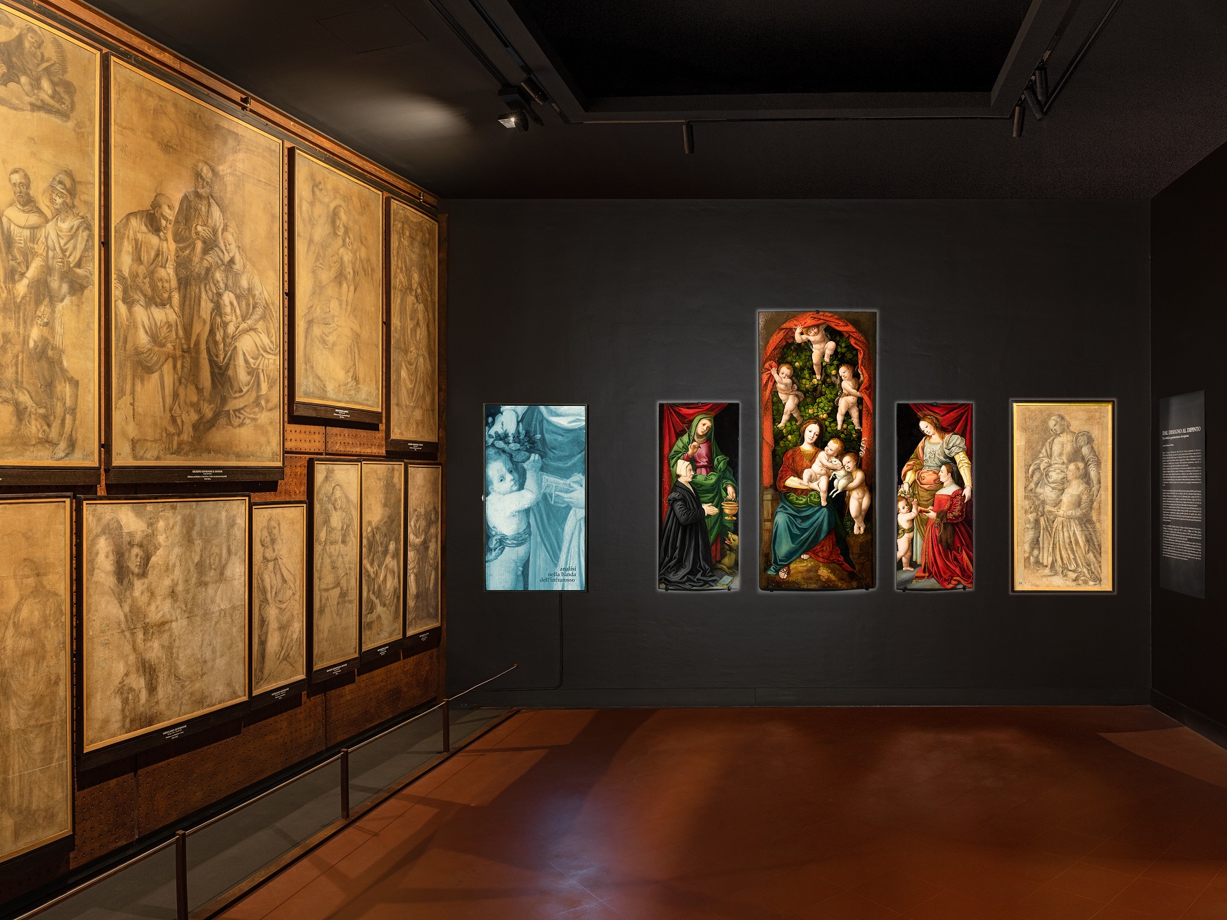 Dopo il recente riallestimento della Sala dei Cartoni gaudenziani, la Pinacoteca dell’Accademia Albertina riprende il suo ciclo di mostre-dossier dedicate a opere pittoriche realizzate nell’ambito della bottega di Gaudenzio Ferrari, messe in dialogo con i materiali grafici di quella stessa officina artistica appartenenti al Museo. Presentiamo in questa occasione un dipinto poco conosciuto della produzione gaudenziana, conservato in collezione privata e oggi visibile al pubblico per la prima volta. L’opera, costituita da tre pannelli lignei di cui sono state modificate le misure e la forma originarie, raffigura nella parte centrale la Madonna con il Bambino, san Giovannino e tre angeli, mentre negli scomparti laterali sono visibili due sante nell’atto di presentare alla Vergine delle dame inginocchiate in preghiera, probabilmente le committenti dell’opera. Le sante sono identificabili grazie ai loro attributi in Marta di Betania (a sinistra, con la Tarasca e l’aspersorio) e Dorotea (a destra, con il canestro da cui sgorgano miracolosamente dei fiori). Il trittico è riconoscibile negli inventari della importante quadreria dell’avvocato Giuseppe Antonio Gattino (1802-1853), che era allestita nelle sale nell’attuale Palazzo Valperga Galleani di Torino, in via Alfieri 6, in cui il collezionista abitò a partire dal 1829. La pinacoteca passò poi per via ereditaria ai conti Ricardi di Netro e infine nel 1929 fu acquisita dall’antiquario torinese Pietro Accorsi e dispersa sul mercato. Le tre tavole qui presentate furono comprate pochi anni dopo dalla famiglia che tuttora le possiede. Gattino aveva acquistato l’opera nel 1830 a Chieri, poco lontano da Torino, dove pare che fosse conservata in San Domenico. Questa dunque potrebbe essere la chiesa per cui fu originariamente commissionata, oppure potrebbe provenire da qualche altro edificio religioso della zona ed essere stata trasferita lì in seguito alle soppressioni napoleoniche degli ordini religiosi (1802), che provocarono la dispersione di una grossa parte del patrimonio artistico piemontese. L’opera è attribuibile al grande pittore di origine valsesiana Gaudenzio Ferrari (nato a Valduggia, documentato a partire dal 1507 e morto a Milano nel 1546), dipinta verosimilmente con l’aiuto di un collaboratore intorno al 1540 o poco prima; la tavola centrale è ispirata alla cosiddetta Madonna degli aranci, una grande pala commissionata nel 1529 a Gaudenzio per la chiesa di San Cristoforo di Vercelli. La collezione della Pinacoteca dell’Accademia Albertina conserva un cartone (il numero 351) raffigurante Santa Dorotea con una devota, che fu probabilmente realizzato dallo stesso Ferrari come traccia grafica per la tavola di destra dell’opera qui presentata. Le indagini scientifiche eseguite sul trittico in occasione del restauro hanno dimostrato, grazie alla tecnica della riflettografia infrarossa, la precisa corrispondenza del disegno preparatorio sulla tavola con il cartone, confermando che proprio questo grande foglio o una sua copia diretta sono stati utilizzati come impostazione per la stesura pittorica.