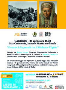 A Candelo, si chiudono in grande le iniziative sull’Antico Egitto nell’ambito della mostra “Liberi di Imparare” ospitata dentro le mura medievali del Ricetto fino al 1 maggio: in Sala Cerimonie (interno Ricetto medievale) sabato 23 aprile ore 15.30 un dialogo tra il Museo Egizio di Torino e il Museo del Territorio Biellese intorno alla figura di Ernesto Schiaparelli, dalla sua formazione scientifica agli incarichi istituzionali e le molte campagne di scavo della M.A.I fino all’eredità attuale presso il Museo del Territorio Biellese