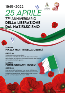 Lunedì 25 aprile 2022 a Santena si festeggia il 77° anniversario della Liberazione dal Nazifascismo. Alle 10:30, in piazza Martiri della Libertà, verrà deposta una corona d’alloro alla lapide dei Caduti di tutte le guerre, con l’intervento della Banda Musicale Canonico Serra.Successivamente, si sfilerà fino al ponte Giovanni Musso, dove si terranno gli interventi delle Istituzioni, dei ragazzi dell’Istituto Comprensivo di Santena e dell’Associazione le Radici e la Memoria (che sarà anche il soggetto coordinatore dell’evento).La cerimonia si concluderà con la testimonianza dei ragazzi e delle ragazze partiti con il Treno della Memoria 2022, con il discorso del Sindaco e con l’inaugurazione del nuovo cippo, costruito dai volontari dell’Associazione Le Radici La Memoria con il supporto dell’Amministrazione comunale e di altri soggetti (che sostituirà i due attuali cippi che si sono deteriorati nel tempo).«Il 25 aprile è una data importante – spiega il sindaco – si celebrano i valori su cui si fonda la nostra comunità. Finalmente questo anno potremo festeggiare in presenza e rendere omaggio a tutti coloro che sono caduti per garantire alle generazioni successive la libertà»