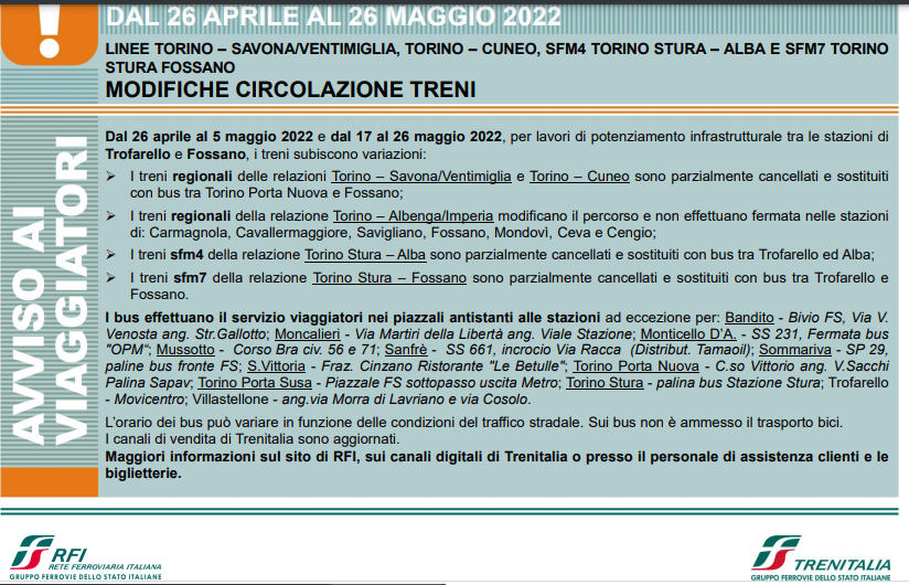 Nei prossimi giorni saranno effettuati da RFI interventi di potenziamento infrastrutturale sul tratto che va da Trofarello a Fossano. La linea sarà potenziata e alla fine i lavori consentiranno il transito dei treni con il massimo carico trasportabile.