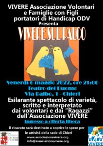 “VIVERE sul Palco”, è il primo degli eventi che l’Associazione Vivere ha organizzato per festeggiare i suoi 35 anni di attività, non solo con fruitori, soci, genitori e volontari ma anche con tutti gli amici che ci seguono e ci sostengono del chierese, territorio assolutamente disponibile e solidale in tutti questi anni. Lo spettacolo andrà in scena venerdì 6 maggio alle ore 21 al Teatro Duomo di Chieri, in via Balbo 1. Ingresso ad offerta libera per il sostegno ai laboratori della sede di Chieri. E’ una produzione dei frequentatori, fruitori e volontari, della sede di Chieri che ha unito più attività e laboratori dei mesi scorsi, per dar vita ad una serata veramente piacevole ed esilarante. Il testo e relativo canovaccio così come l’impianto scenico, le musiche e le coreografie sono frutto della collaborazione tra i vari laboratori svolti da ottobre ad oggi. Fruitori e volontari hanno partecipato con entusiasmo a questi interessanti pomeriggi di ideazione, di lavori, di battute, di prove e di invenzioni fino al raggiungimento di un accordo su ciò che poteva essere utile e divertente per lo spettacolo. Tutti hanno collaborato alla realizzazione finale lasciando grande spazio per l’improvvisazione nel seguire una traccia piùttosto che lo studio di un vero e rigido copione. Si può considerare “il meglio” delle attività svolte sfruttando l’estro e la fantasia di tutti. E’ nato così uno spettacolo-commedia che vede protagonista il presentatore di “Vivere sul Palco” che ha delle grosse difficoltà a portare a termine il suo lavoro perchè intralciato e disturbato dall’inopportuno intervento di alcuni fantasmi dispettosi che abitano nel teatro e che vorrebbero impedirgli di proseguire nella presentazione di scenette, danze, canti ed esibizioni varie. Riuscirà il nostro presentatore ad arrivare alla fine dello spettacolo? Chi avrà la meglio? Lui o i dispettosi fantasmi? La risposta ovviamente si avrà solo alla fine della serata. Venite e vi divertirete.