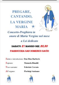 Felicemente accolta dalla Parrocchia di San Domenico Savio, (via Tosi – Asti -) nelle persone dei Parroci Don Mario Banaudi e Don Dino Barberis, ritorna, per il secondo anno consecutivo, la celebrazione del Mese Mariano, nella formula Concerto-Preghiera, per volontà di Manuela Rinaldi e Pierluigi Amisano. Verranno lette preghiere, recitate letture, suonati e cantati brani dedicati alla Vergine Maria.