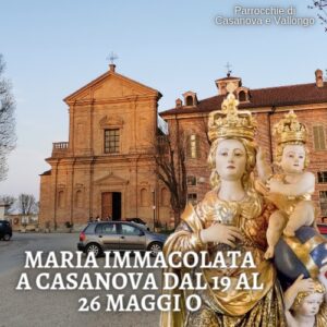 Tutto pronto a Casanova per l’arrivo della statua dell’Immacolata Concezione, Patrona della Città di Carmagnola, che nel mese di maggio è pellegrina nelle Parrocchie dell’Unità Pastorale 53 di Carmagnola. Giovedì 19 maggio alle 20,45 sulla piazza antistante la cistercense Abbazia di Casanova ci sarà l’accoglienza della statua e la processione di ingresso nella chiesa parrocchiale. Alle 21 S. Messa presieduta dal Parroco Rev. don Iosif Patrascan. La celebrazione verrà trasmessa in diretta sulla pagina Facebook “Parrocchie di Salsasio, Casanova e Vallongo”. L’Immacolata Concezione che ora è in pellegrinaggio a Salsasio, si fermerà nella Parrocchia di Casanova fino a giovedì 26 maggio quando verrà accolta a San Giovanni.