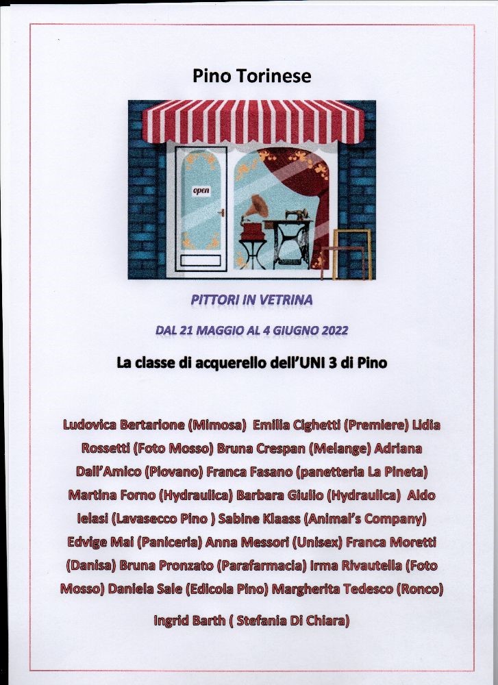 I lavori realizzati dagli allievi dei corsi di pittura dell’Unitre verranno esposti nei negozi di Pino. Nella locandina qui di seguito potrai leggere i nomi degli artisti e il negozio che ospita le loro opere.