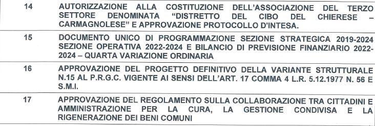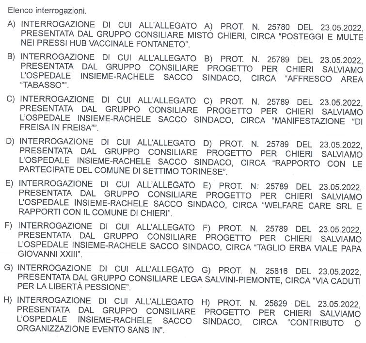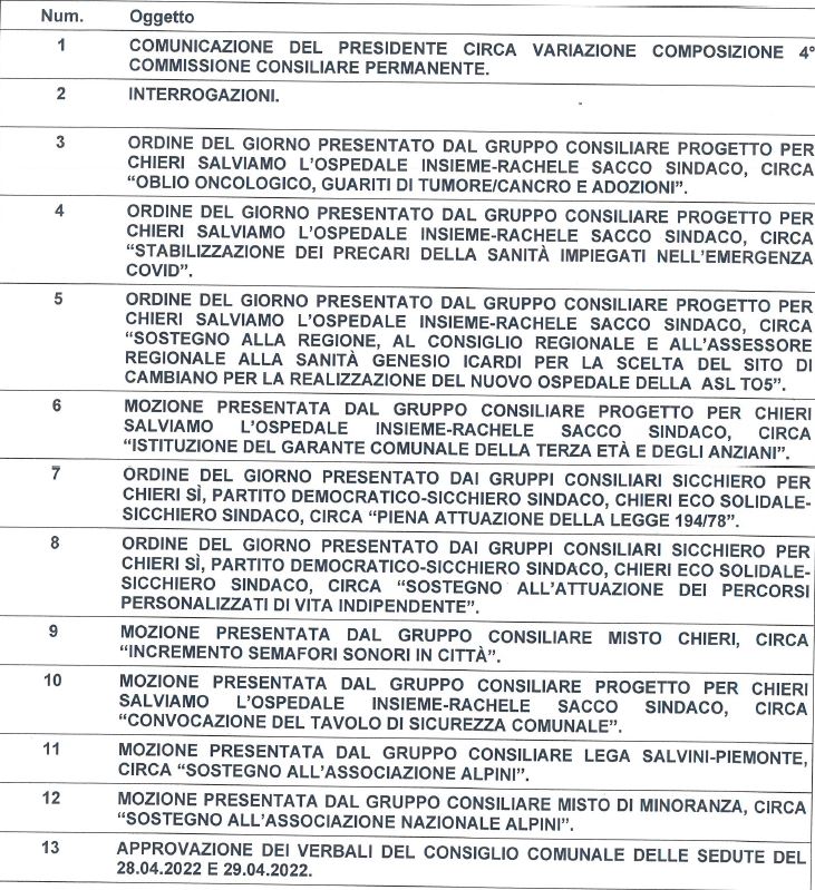 Il consiglio comunale di Chieri è convocato in sessione ordinaria lunedì 30 e martedì 31 maggio alle 19.45. Ecco l’ordine del giorno.
