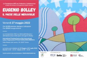 Venerdì 27 maggio si è inaugurata a Torino la mostra “Eugenio Bolley. Il Paese delle Meraviglie”, a cura di Daniela Magnetti, presso l’International Training Centre of the International Labour Organization (ITCILO). Promossa dalla Fondazione AIEF per l’infanzia e l’adolescenza, in collaborazione con ITCILO, il gruppo Sella e la Direzione Artistica di Banca Patrimoni Sella & C., la mostra intende essere un racconto a colori, dedicato ai bambini e agli adolescenti, in occasione della ricorrenza della ratifica italiana della Convenzione ONU sui diritti dell’infanzia e dell’adolescenza. La Convenzione rappresenta lo strumento normativo internazionale più importante e completo in materia di promozione e tutela dei diritti dell’infanzia e a oggi 193 Stati ne fanno parte. Approvata dall’Assemblea Generale delle Nazioni Unite il 20 novembre 1989 a New York ed entrata in vigore il 2 settembre 1990, in Italia è stata ratificata il 27 maggio 1991 con la Legge n. 176. Il ruolo sociale dell’arte contemporanea, leitmotiv di molti progetti sostenuti dalla Direzione Artistica di Banca Patrimoni Sella & C., trova qui una nuova declinazione: le opere pittoriche di Bolley, rese disponibili dalla Fondazione AIEF, vengono esposte non in un museo, ma in un centro internazionale di formazione nel quale trovano posto professionisti ed eccellenze da tutto il mondo. La mostra, con la sua capacità di parlare mille lingue attraverso l’arte e il colore, si inserisce a pieno nei progetti sviluppati dall’ITCILO, volti a promuovere una crescita inclusiva sostenuta e sostenibile: così come i formatori del centro «guidano i partecipanti in un viaggio di apprendimento, con workshop, visite di studio e le ultime tecnologie pedagogiche», allo stesso modo questo percorso espositivo si propone come stimolo narrante per attività da condurre insieme ai bambini e ai ragazzi. La mostra, seguendo una modalità inusuale, ha aperto le sue porte al pubblico prima dell’inaugurazione: dal 10 maggio, infatti, oltre 350 giornalisti provenienti da tutto il mondo, ospiti presso le strutture dell’ITCILO in occasione dell’Eurovision Song Contest (Torino, 10 – 14 maggio 2022), hanno avuto modo di vedere le opere del Maestro. Nella selezione di dipinti esposti, che spaziano attraverso tutta la produzione pittorica dell’artista, i visitatori possono ammirare mille cromie accostate con emozionante equilibrio lirico, lettere dell’alfabeto che raccontano del primo linguaggio, segni che hanno il fascino delle scritture sconosciute. Nel proporre la pittura di Bolley, che è esercizio ludico, sereno e libero, questa esposizione vuol essere un passe-partout per grandi e piccini verso quel Paese delle Meraviglie che ogni bambino dovrebbe avere il diritto di conoscere.