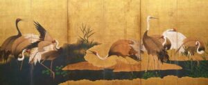 La gru è un uccello dalla forte valenza simbolica in Asia orientale e, per la sua bellezza e le sue movenze aggraziate, è considerato un generico emblema di buon augurio. Per la sua capacità di compiere lunghe migrazioni, che creano l’illusione di un perpetuo ritorno da luoghi lontani, in Cina le gru sono anche state associate agli immortali taoisti, per i quali, secondo l’iconografia tradizionale, costituiscono spesso il mezzo di trasporto prediletto. Queste messaggere delle divinità sono quindi, prima di tutto, una metafora di longevità. In occasione di una delle periodiche rotazioni a scopo conservativo che interessano la galleria giapponese, viene esposta la raffinata coppia di paraventi “Gru (tsuru)” del XVII secolo: quindici gru di varie specie sono raffigurate in un ambiente palustre, avvolto in una nebbia dorata. Il baluginio e la luminosità dei paraventi, che quasi rischiarano la sala, sono dovute al prezioso sfondo in foglia d’oro (kinpaku), riportato al suo antico splendore grazie a un restauro finanziato nel 2011 dall’Associazione Amici della Fondazione Torino Musei. Lo stile naturalistico è caratterizzato dalla pienezza dei colori, da un’attenta ricerca di pose differenziate ed eleganti e dall’armonia dell’insieme. Nella stessa sala sarà collocata un’altra coppia di paraventi a sei ante risalenti al XVII secolo che raffigura una ricca composizione di crisantemi in fiore. Il soggetto è di origine cinese, richiama la stagione autunnale ed è simbolo della vita appartata del letterato lontano dagli incarichi ufficiali. In Giappone conobbe un grandissimo successo, tanto da essere adottato anche come stemma dalla famiglia imperiale: una corolla di crisantemo dorata a 16 petali, che evoca lo splendore del sole. La rotazione conservativa prosegue al secondo piano della galleria giapponese con l’esposizione di otto kakemono, i delicati dipinti su rotolo verticale, e una selezione di lacche, tra cui emerge una scatola per la cerimonia del tè (chabako) con fondo rosso e fini tralci vegetali decorati con foglie e fiori in rilievo in ceramiche di vari colori, metalli dorati e madreperla. Lo stile evocato è chiamato “Haritsu”, dal nome del poliedrico artista Ogawa Haritsu (1663-1747), apprezzato decoratore di lacche polimateriche, pittore e poeta di haiku.