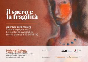 Il progetto Rodello Arte, a cura della Fondazione Museo Diocesano con l’associazione Colline e Culture, la Fondazione Santi Lorenzo e Teobaldo ed il Comune di Rodello, giunto alla sua sesta edizione, intende riflettere in modo concreto e dialogico sul concetto di arte sacra, sulla sua produzione e sul rapporto tra artisti e committenza. L’iniziativa, nata nel 2017, ha sinora raccolto intorno a sé sessanta artisti provenienti da diverse parti d’Italia e d’Europa, afferenti a discipline artistiche differenti. Nelle prime edizioni le opere prodotte hanno rappresentato il rapporto tra il sacro e la terra e tra il sacro e il viaggio. I temi ispiratori del terzo biennio sono il Sacro e la Fragilità. Ogni anno il progetto seleziona, attraverso una call, artisti che vengono ospitati per due giorni nelle Langhe per vivere un’esperienza di residenzialità con incontri formativi condotti da specialisti. Il progetto del 2022 si è svolto con un workshop on line nel mese di marzo ed un workshop residenziale di due giornate nel mese di aprile che attraverso testimonianze, esperienze e laboratori, ha promosso il confronto sui temi ispiratori della call. Sabato 4 giugno verrà inaugurata la mostra che ospiterà le opere prodotte dagli artisti coinvolti nella VI edizione del progetto “Rodello Arte”. La sede sarà il “Museo di arte sacra contemporanea” di Rodello, aperta per l’occasione dalle ore 11 alle ore 12.30 e dalle ore 15 alle ore 18. Le aperture della mostra proseguiranno fino a domenica 16 ottobre 2022. In collaborazione con l’Associazione Volontari per l’Arte, gli operatori museali del Museo Diocesano di Alba e con l’Amministrazione Comunale di Rodello sarà possibile visitare la mostra temporanea “Il sacro e la fragilità”.