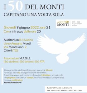 Il liceo Monti di Chieri compierà a ottobre 50 anni e per l’occasione si darà il via concreto ai preparativi per il cinquantenario giovedì 9 giugno 2022 presso l’auditorium R. Livatino. Chiunque sia interessato a essere presente, il ritrovo sarà alle 20 per un breve rinfresco, cui seguirà alle 21 la definizione delle attività di promozione dell’iniziativa.