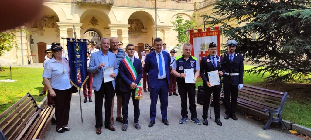 Celebrata nel cortile del Comune la Festa del 2 Giugno a Chieri. Presenti il sindaco Sicchiero e il direttore generale dell’asl To 5 Perscarmona, oltre al tradizionale concerto della Filarmonica Chierese sono state consegnate dall’asl benemerenze alle associazioni di volontariato chieresi (nella foto)